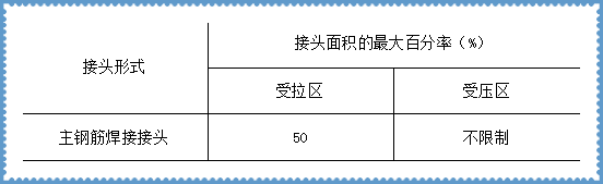 3.2 受力鋼筋的連接街頭應設置在內(nèi)力較小處,并應錯開布置。對焊接接頭和機械連接接頭,在接頭長度區(qū)段內(nèi),同一根鋼筋不得有兩個接頭。配置在接頭長度區(qū)段內(nèi)的受力鋼筋,其接頭的截面面積占總截面面積的百分率,應符合表1的規(guī)定。