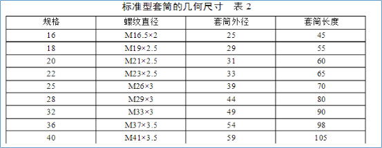 剝肋滾絲頭加工尺寸應符合表1的規(guī)定。絲頭加工長度為標準型套筒長度的1/2,其公差為+2P(P為螺距)。